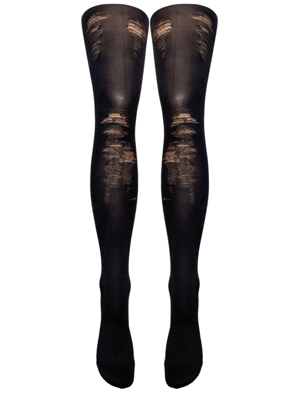 The "Ripped Jean" Aesthetic: Perfectly captures the rock-and-roll energy of distressed denim but in a sheer, sophisticated hosiery format.
